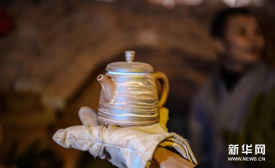 2021年1月1日,一名坭兴陶从业人员在钦江古龙窑展示一把有窑变特色的坭兴陶壶。新华社记者 张爱林 摄
