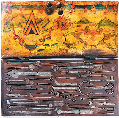 在藏语中,“曼巴”指医生,“曼唐”意为医药唐卡。曼唐器械展厅展出的80幅唐卡,是根据西藏医算院收藏的17世纪曼唐原件临摹而成,共包含6480幅彩色图案,图文并茂地展现了藏医药学精华。展厅里还有各种古代藏医手术器械,多以合金为材质,做工精巧,部分器械头部及手柄采用镀金银、错金银工艺。
