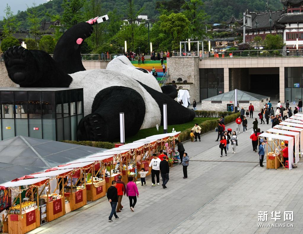 4月7日,在四川省都江堰市仰天窝广场,游客在“自拍熊猫”雕塑旁边的文创集市消费。新华社记者 王曦 摄