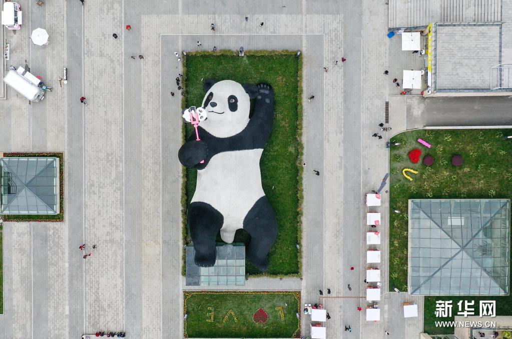 这是4月7日在四川省都江堰市仰天窝广场拍摄的“自拍熊猫”雕塑(无人机照片)。新华社记者 王曦 摄