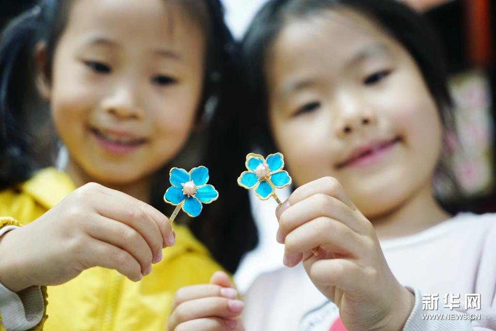 4月24日,小朋友在浙江嘉兴博物馆展示自己制作的仿“点翠”发夹。新华社发(金鹏 摄)