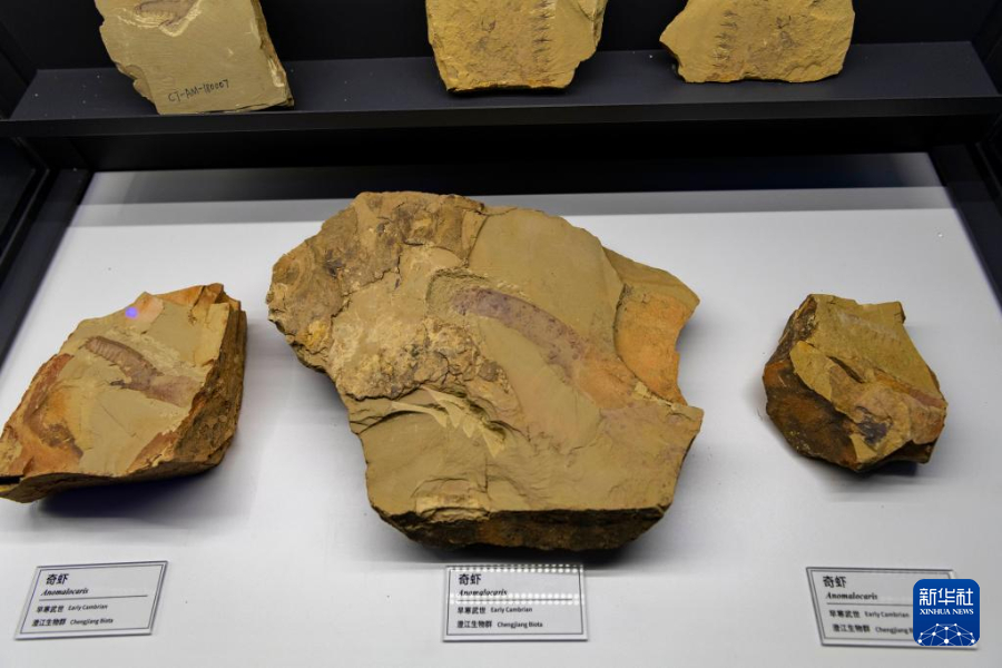 10月14日在澄江化石地世界自然遗产博物馆拍摄的奇虾化石。澄江化石地世界自然遗产博物馆位于云南省玉溪市,是集收藏、研究、展示、教育为一体的大型自然博物馆,以化石为主题阐释生命起源、生命演化和生物多样性等内容。作为我国首个建在化石地遗址上的自然博物馆,该馆收藏了来自世界各地的珍稀古生物化石和现生动物标本6万余件,其中尤以5.2亿年前的澄江生物群为代表,揭示了寒武纪时期的生命演化进程。新华社记者 陈欣波 摄