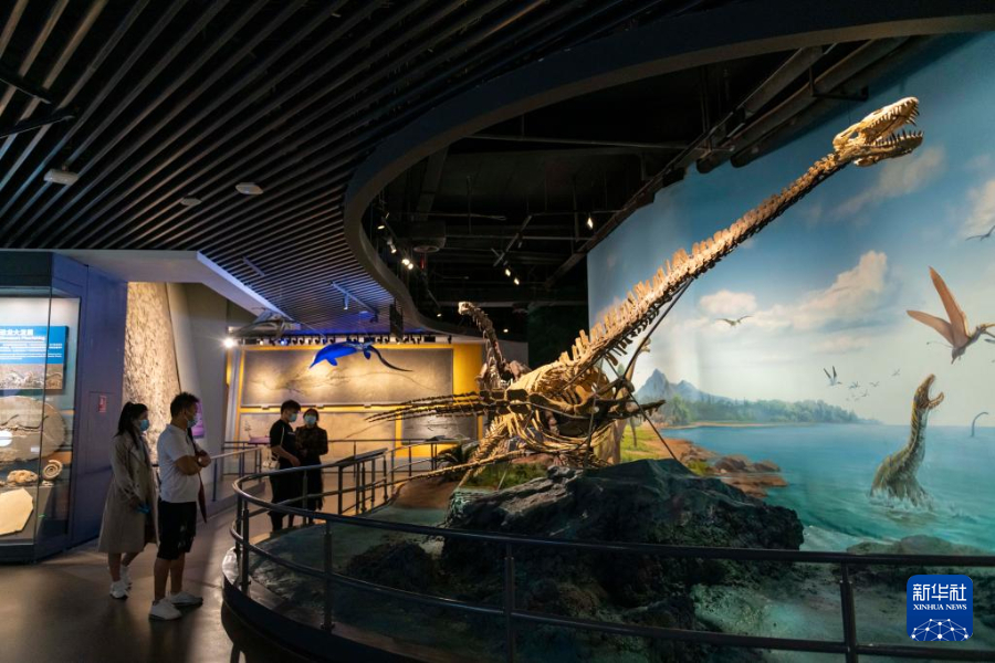 10月14日,游客在澄江化石地世界自然遗产博物馆参观蛇颈龙化石。新华社记者 陈欣波 摄
