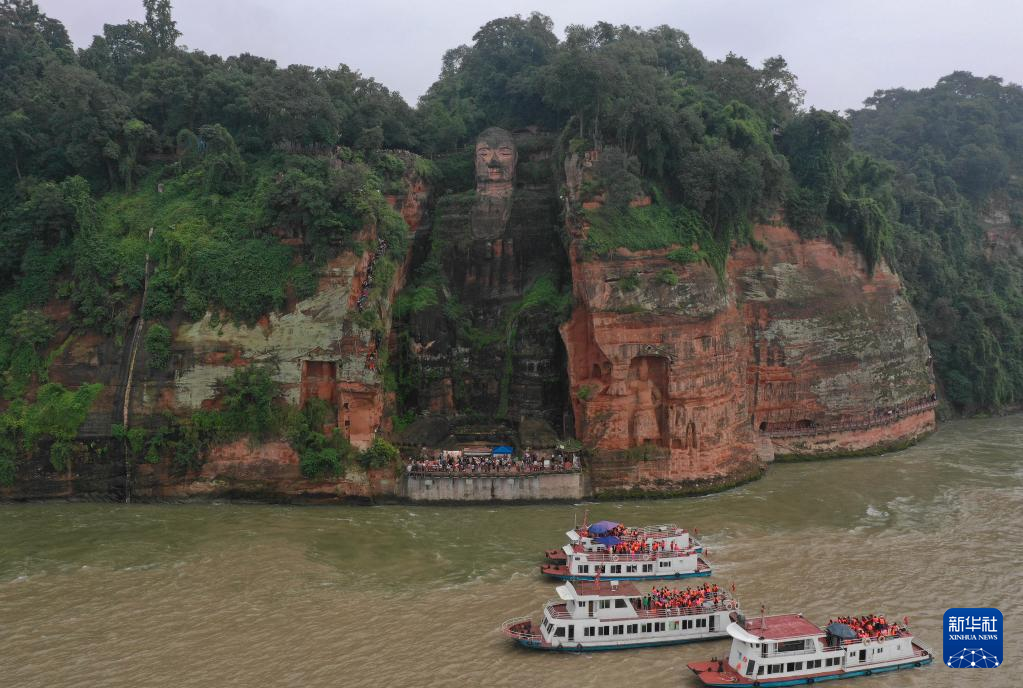游客乘坐游船参观乐山大佛(2018年10月4日摄,无人机照片)。