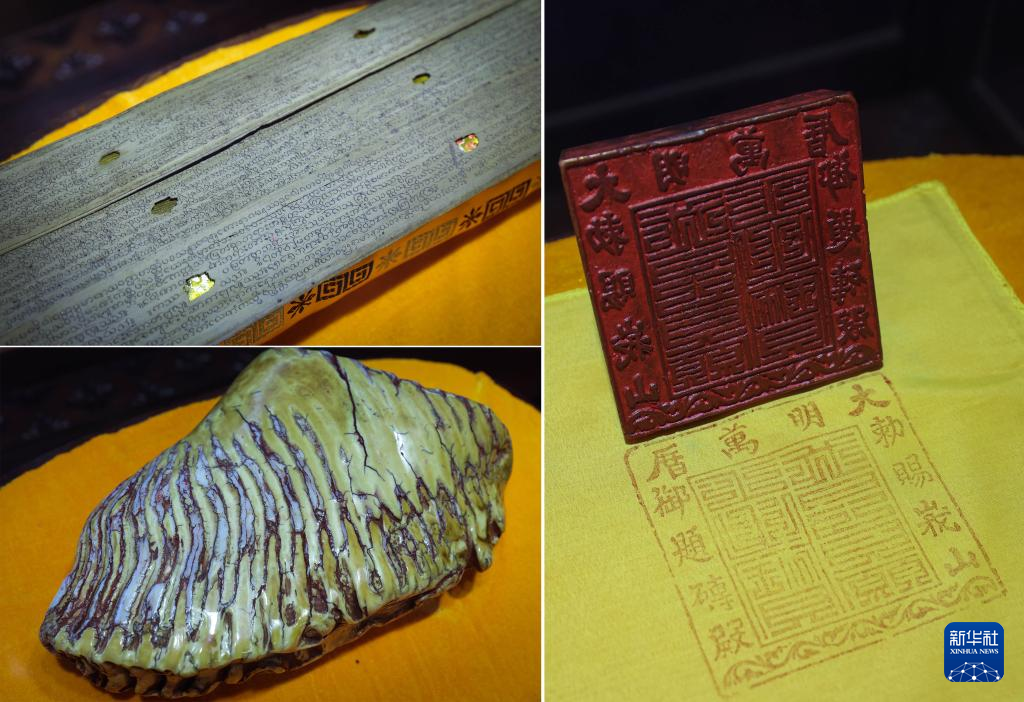 珍藏在峨眉山景区万年寺的“三宝”:贝叶经(左上)、佛牙(左下)和御印(6月6日摄,拼版照片)。