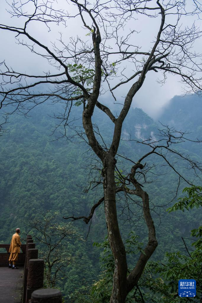 在峨眉山景区遇仙寺,一位僧人远眺群峰(5月18日摄)。