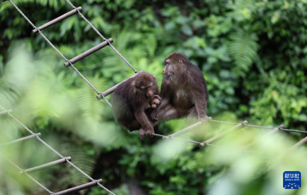 在峨眉山景区自然生态猴区,猴子在吊桥上休憩(6月5日摄)。
