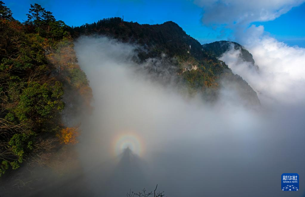 峨眉山景区雷洞坪的“佛光”景观(2015年10月18日摄)。“佛光”是由于阳光照在云雾表面,经过衍射和漫反射作用而形成的自然景观。