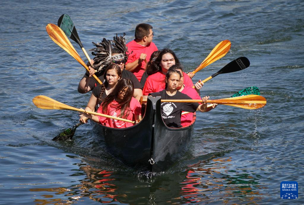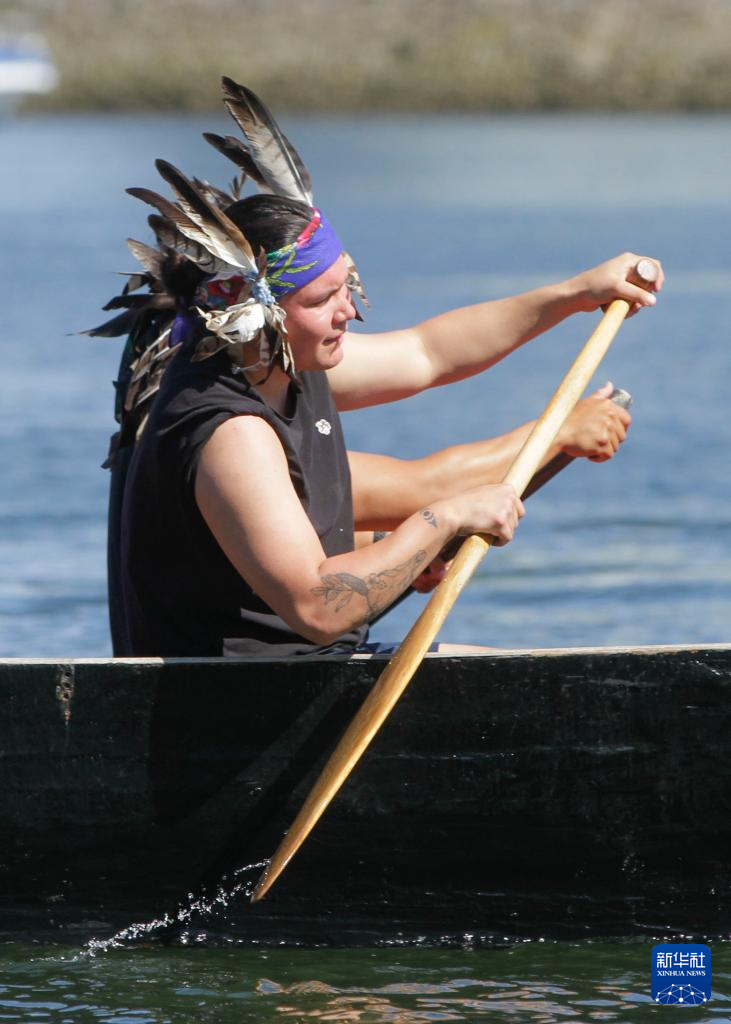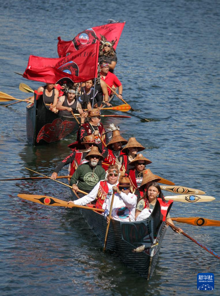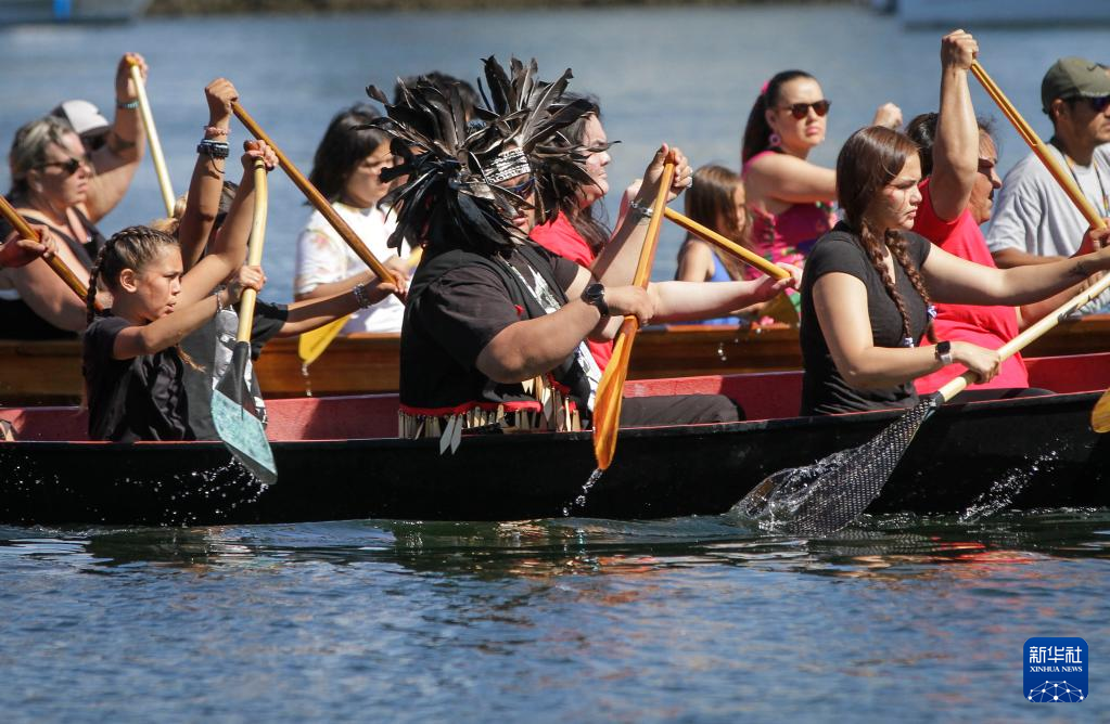 当日,一些加拿大原住民家庭参加独木舟抵达仪式,庆祝展示加拿大西北海岸原住民独木舟文化和生活方式的“神圣之旅”展览在温哥华科学馆开幕。
