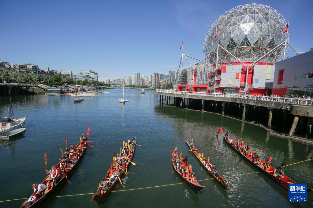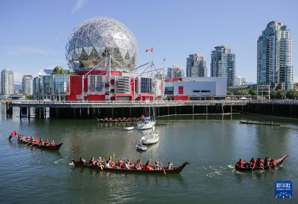7月14日,在加拿大温哥华,人们划独木舟经过温哥华科学馆。