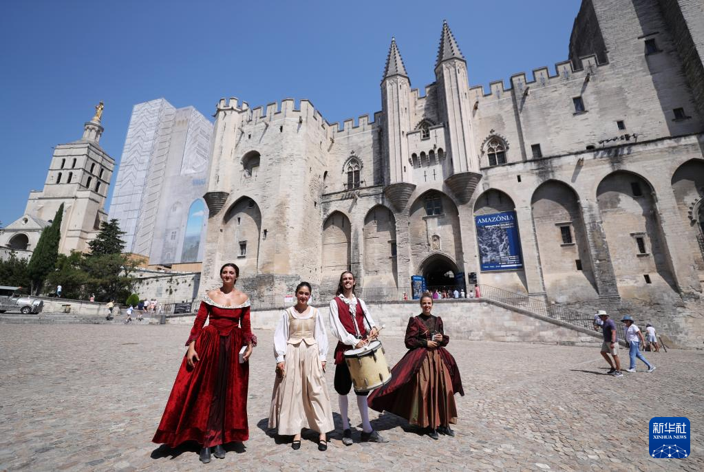 7月19日,在法国南部城市阿维尼翁,演员身着戏服在教皇宫前推介自己的剧目。