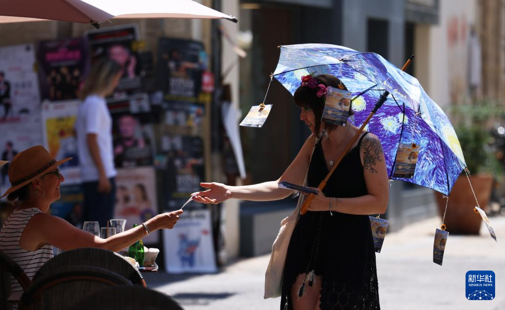 7月19日,在法国南部城市阿维尼翁,一名演员在街头向人们推荐剧目。