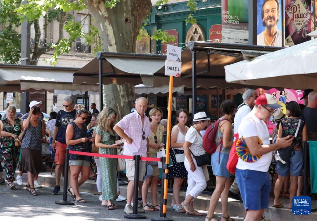 7月19日,在法国南部城市阿维尼翁,人们排队进入剧场观看戏剧。