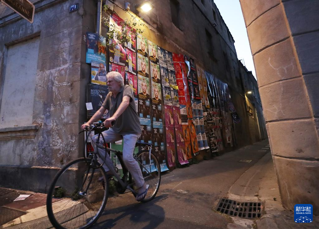 7月19日,在法国南部城市阿维尼翁,一名男子骑车经过街头的戏剧节海报墙。