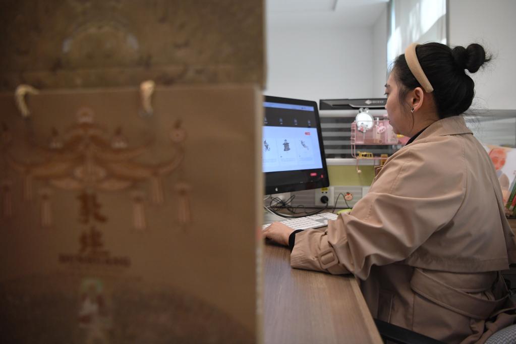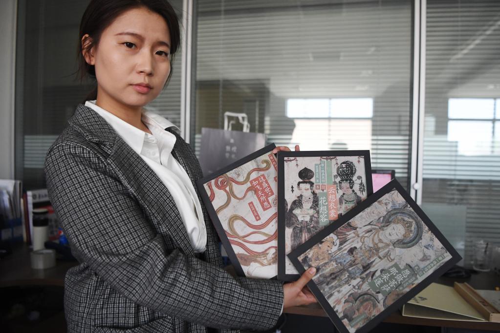 敦煌研究院文物数字化保护团队创意营销人员廖雪婷展示敦煌壁画文创产品(4月25日摄)。新华社记者 方欣 摄