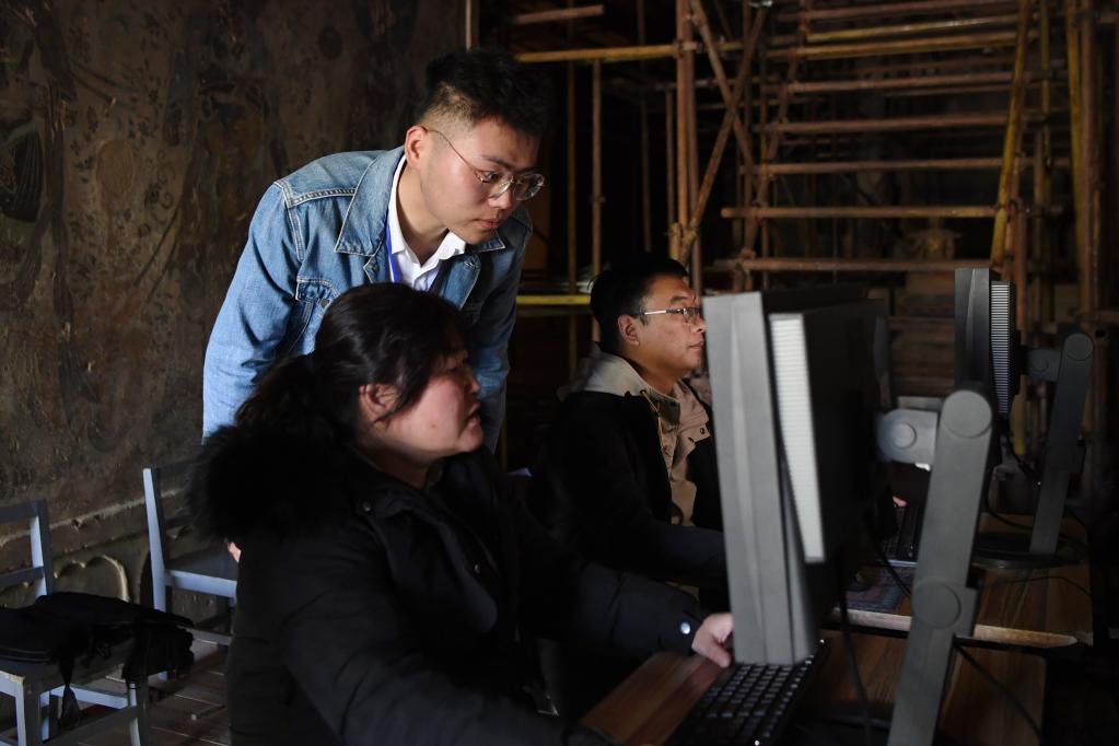 敦煌研究院文物数字化保护团队成员熊业腾(中)和同事在洞窟内查看刚刚采集到的图片(4月25日摄)。新华社记者 方欣 摄