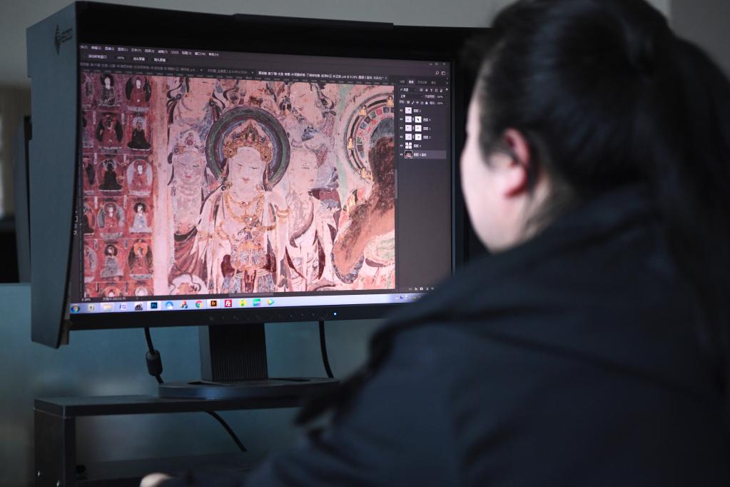 敦煌研究院文物数字化保护团队图像处理人员年海丽正在拼接壁画图像(4月25日摄)。新华社记者 陈斌 摄