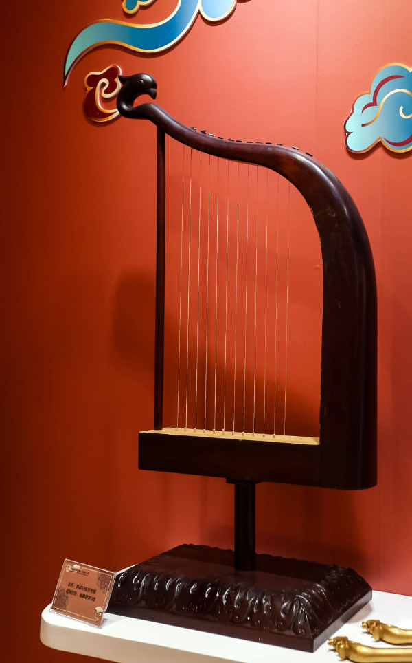 上海民乐一厂仿榆林窟第3窟凤首12弦竖箜篌亮相上海国际乐器展。(受访机构供图)