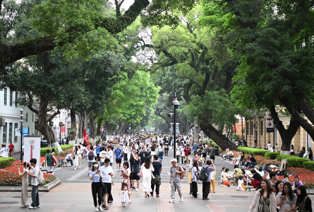 广州沙面大街游人如织(4月13日摄)。19世纪中叶,沙面沦为英、法租界,留下150多栋欧洲风格建筑,堪称“万国建筑博物馆”。2013年,沙面入选中国历史文化名街。按照整体提升、功能完善、历史保护、活化利用等发展理念, 沙面先后推进全域化服务社区治理、环境提升、文物活化利用等工作,实现老街区新活力。如今,沙面岛被称为广州的“城市会客厅”,成为市民和游客的“网红”打卡地。新华社记者 邓华 摄