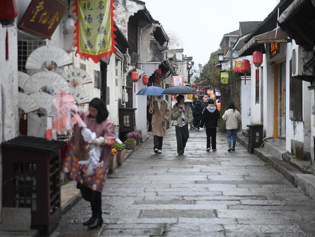 2024年2月20日,人们在细雨中游览绍兴仓桥直街。新华社记者 翁忻旸 摄
