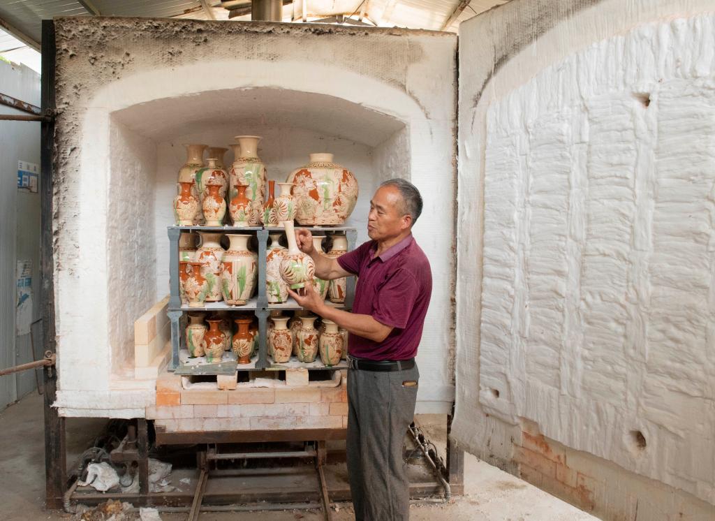 5月23日,在界首市田营镇卢窑村,界首彩陶烧制技艺市级非遗传承人卢一林查看新出窑的彩陶。 新华社记者 傅天 摄