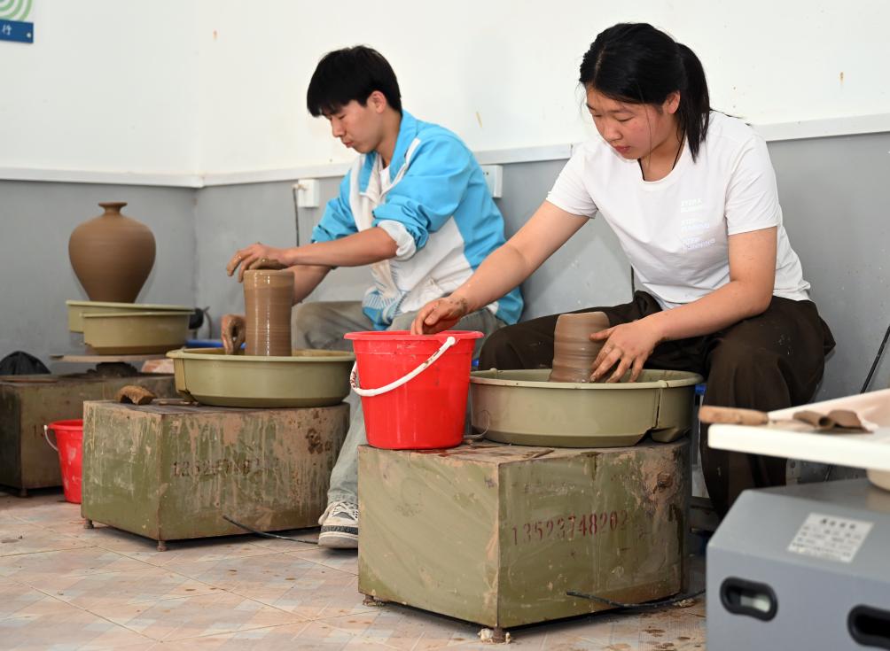 5月24日,在位于界首市的阜阳科技工程学校,学生在学习界首彩陶烧制技艺。 新华社记者 周牧 摄