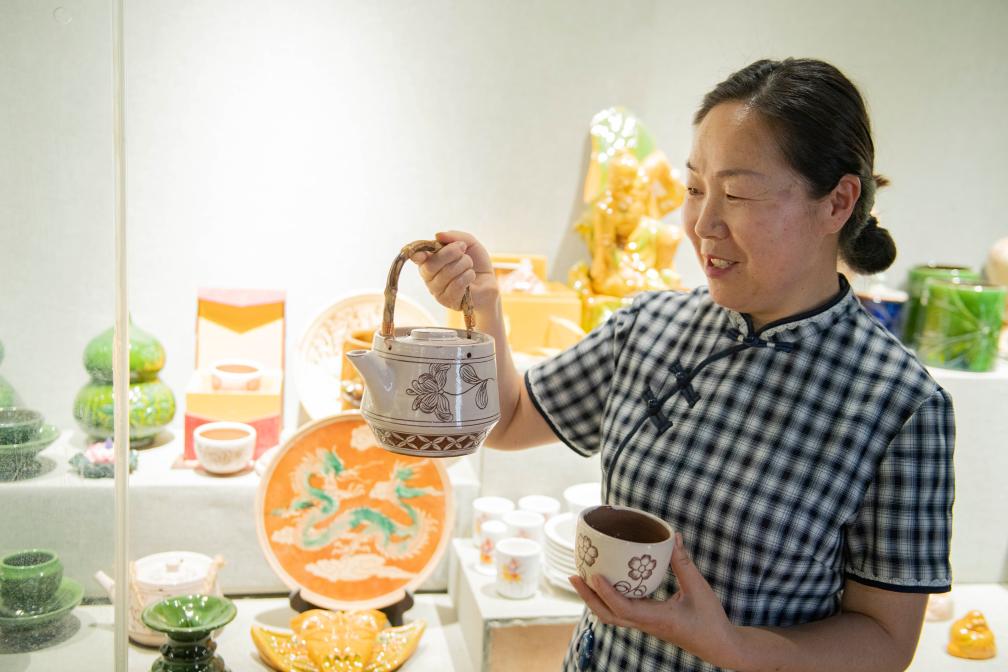 在邢淑芹看来,界首彩陶源于生活,如今就要回归生活。她设计了饰品、笔筒、餐具等界首彩陶文创产品,还接受定制,受到消费者喜爱,让界首彩陶烧制技艺以创新的形式展现在人们眼前。