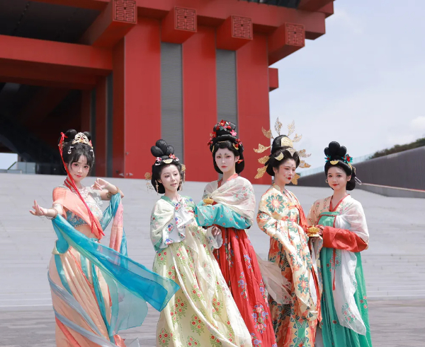随后,中华艺术宫“东方之冠”的朱檐之下,一场敦煌文化的Cosplay渐次展开,摇曳生姿的飞天,头饰步摇的供养人,反弹的琵琶,纤美的腰鼓……把中华艺术宫妆点得仿若“东方的敦煌”!