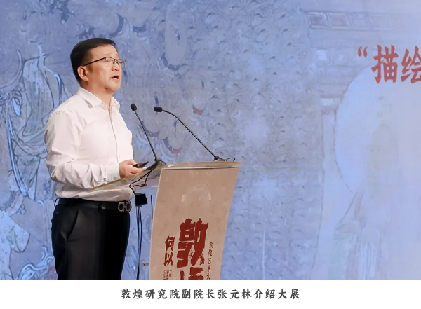 敦煌研究院副院长张元林详细介绍了敦煌文化精华,以及本次大展的展陈思路和诸多亮点,包括莫高窟6座经典洞窟1:1复制窟,六件在上海首次展出展品,6件价值珍贵“藏经洞遗书”原件及其复制品。