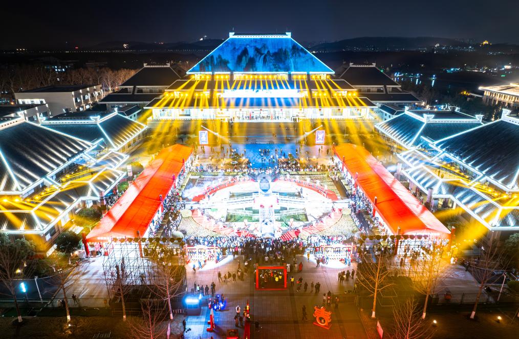2月12日拍摄的湖北省博物馆“钟鸣楚天元宵夜”灯会活动(无人机照片)。新华社记者 肖艺九 摄