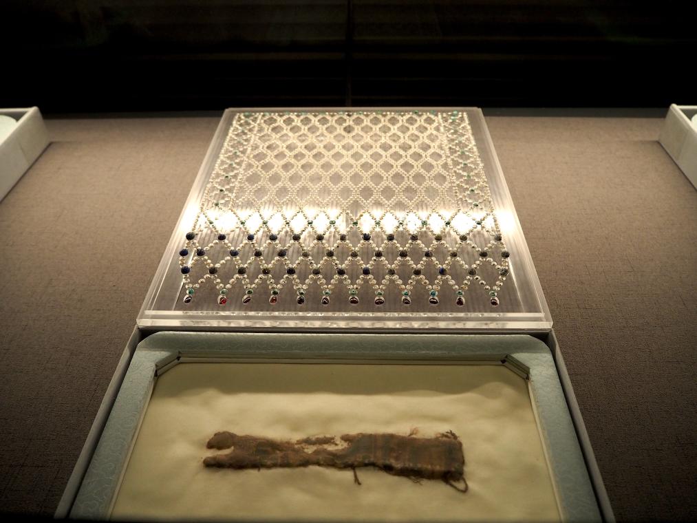 修复后的王冠纺织品内衬在定制好的展示匣中。(新华社记者白玛央措 摄)