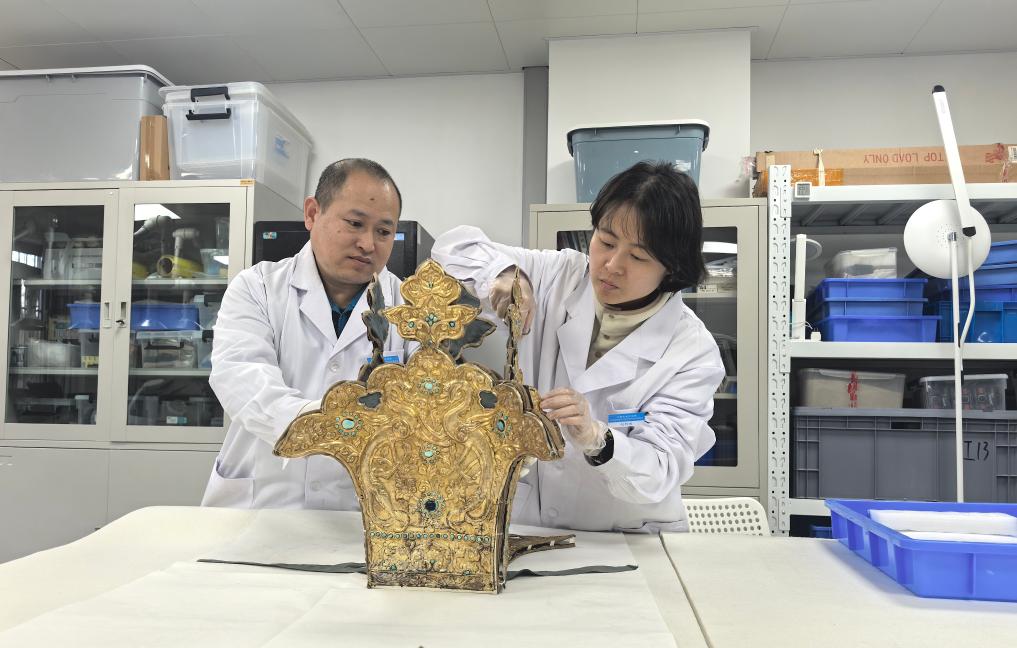 中国社会科学院科技考古与文化遗产保护重点实验室助理研究员黄希(右)与同事修复王冠。(受访者供图)
