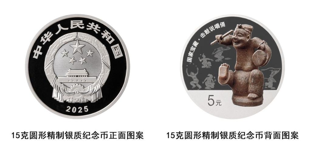 15克圆形银质纪念币背面图案为击鼓说唱俑造型,衬以汉代画像砖图案,并刊“国家宝藏·击鼓说唱俑”字样及面额,最大发行量10000枚。