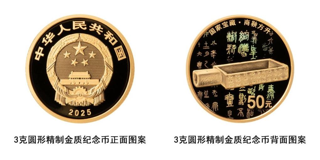 3克圆形金质纪念币背面图案为商鞅方升造型,衬以商鞅方升局部铭文字样,并刊“国家宝藏·商鞅方升”字样及面额,最大发行量5000枚。