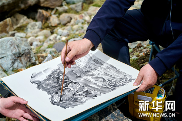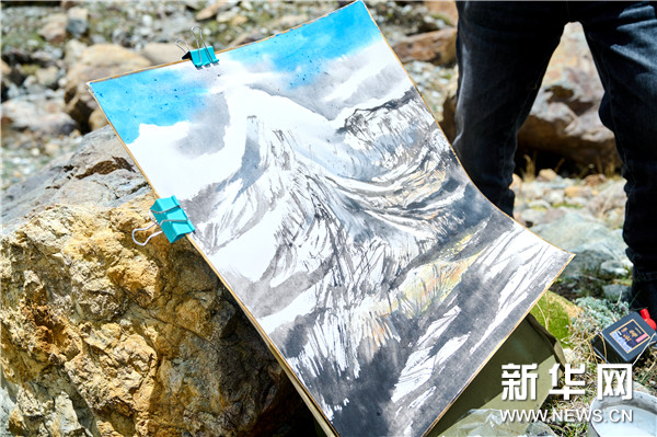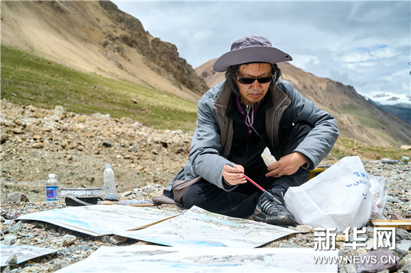 中国国家画院山水所画家、民盟中央美术院副院长顾平在廓琼岗日冰川写生