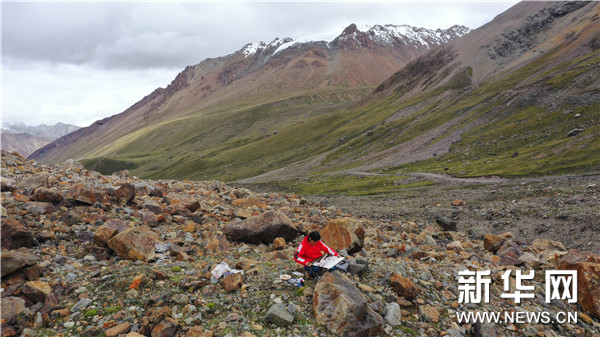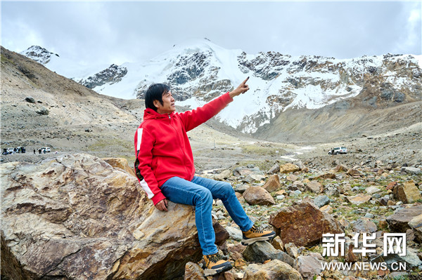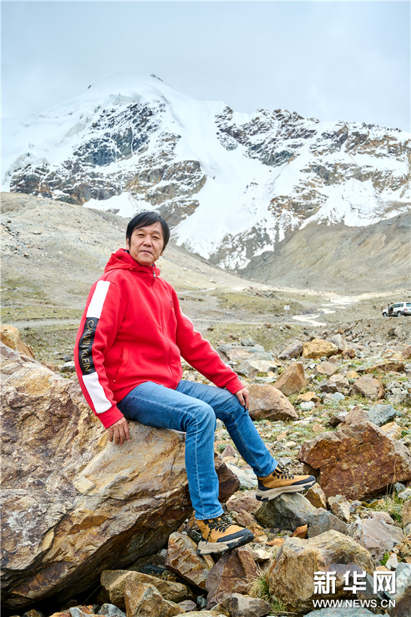 西藏中国高原画派研究院院长、西藏自治区美术家协会名誉主席唐天源在廓琼岗日冰川寻找创作灵感