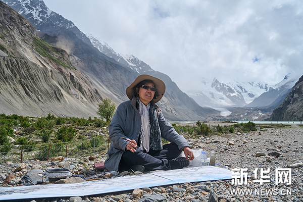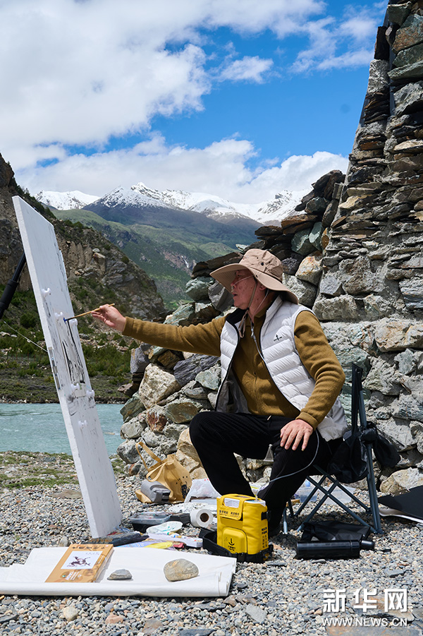 中国文艺志愿者协会副主席、中国美术家协会理事、中国国家画院美术馆原馆长何加林在祥格拉冰川现场写生