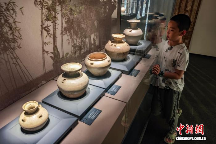 7月30日,江苏南京,小朋友在六朝博物馆内参观展陈的青瓷点彩盘口壶(左一)、青瓷点彩罐(左三)等文物。正值暑期,南京文博场馆迎来参观热潮。中新社记者 泱波 摄