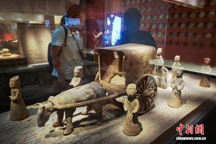 7月30日,江苏南京,观众在六朝博物馆内参观展陈的陶牛车及陶俑群等文物。正值暑期,南京文博场馆迎来参观热潮。中新社记者 泱波 摄