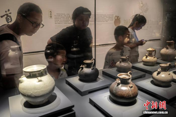 7月30日,江苏南京,观众在六朝博物馆内参观展陈的黑釉鸡彩壶等文物。正值暑期,南京文博场馆迎来参观热潮。中新社记者 泱波 摄