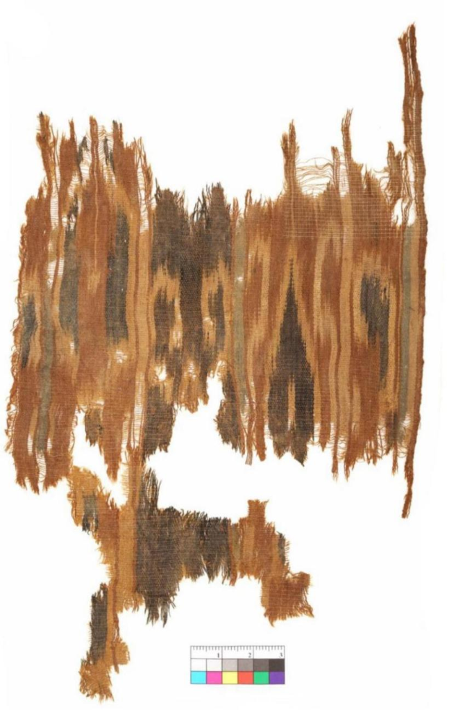 2018血渭一号墓出土的扎经染色织物实物图。(中国社科院供图)