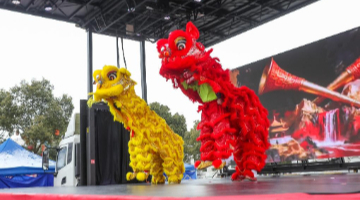 2月7日,民间艺人在江苏省句容市举办的年货大集活动中表演舞狮。