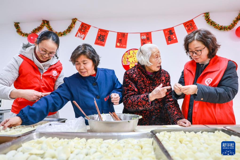 2月11日,江苏省泰兴市济川街道康乐老年公寓内,商井社区志愿者与老人们一起包饺子。