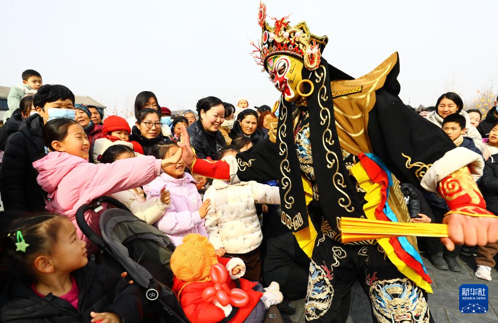2月10日,在河南省周口市川汇区关帝庙广场,进行表演的民间艺人与观众互动。