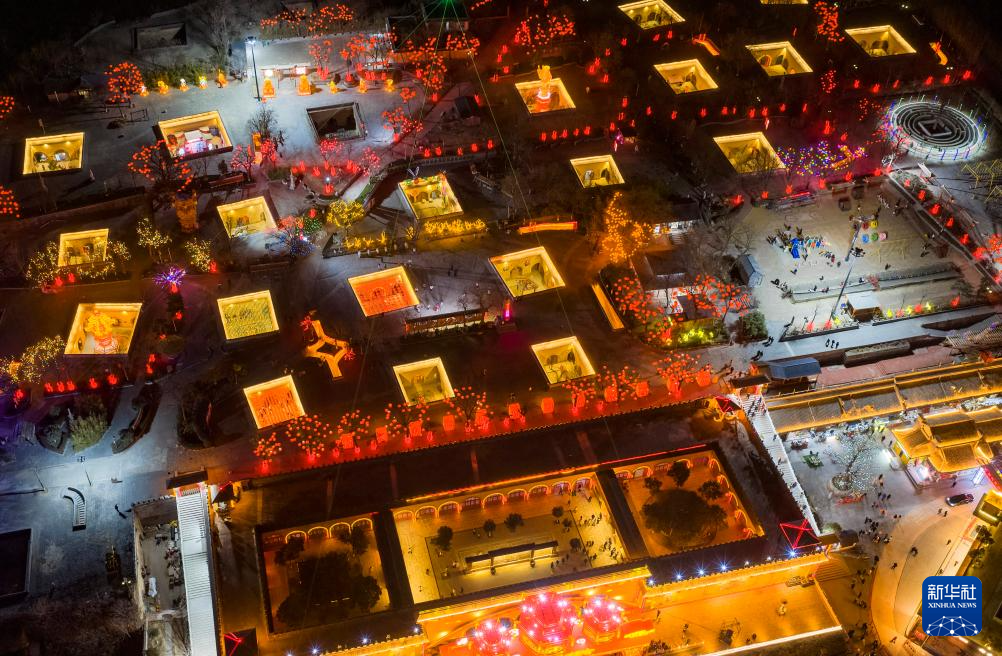 2月10日,人们在河南省三门峡市陕州区地坑院景区欣赏花灯(无人机照片)。