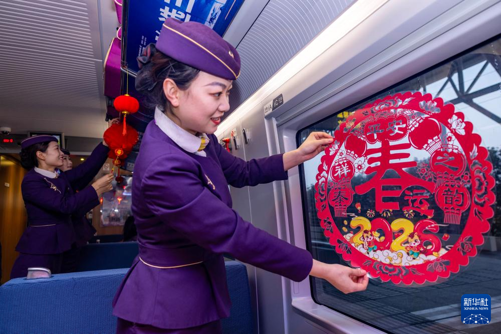 2月11日,南京客运段G2584次列车乘务员在餐车内贴窗花。