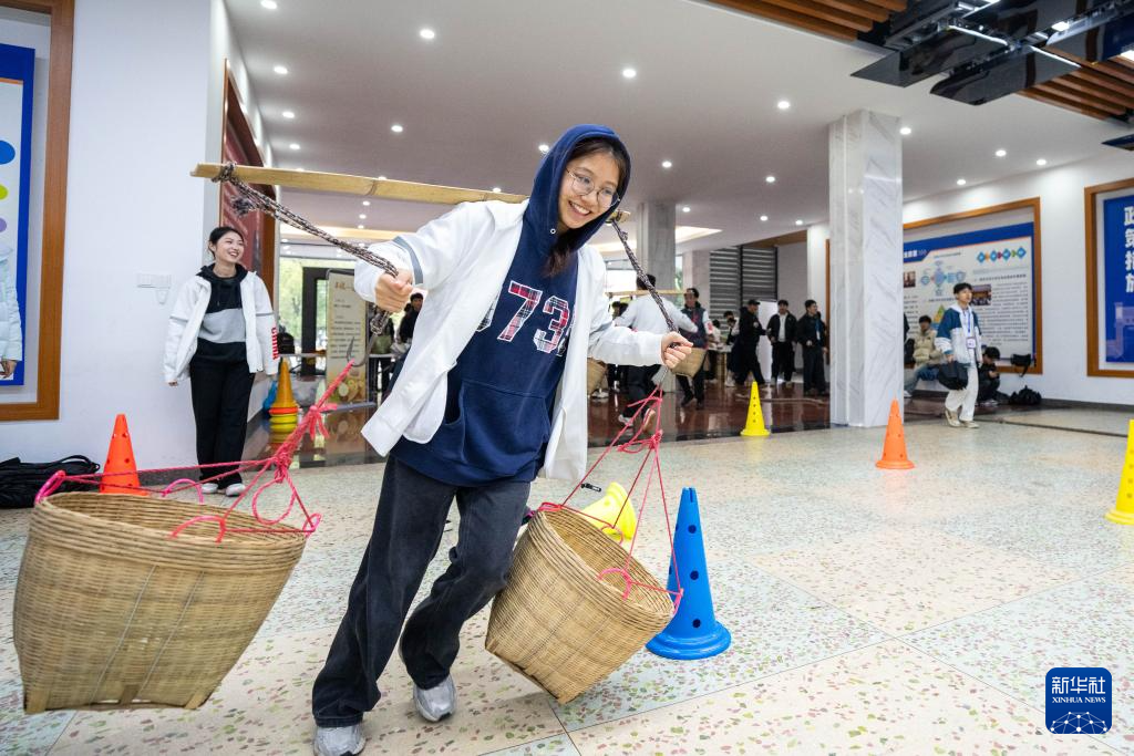 3月19日,学生在湖南农业大学参加农趣运动游戏——竞速搬运。