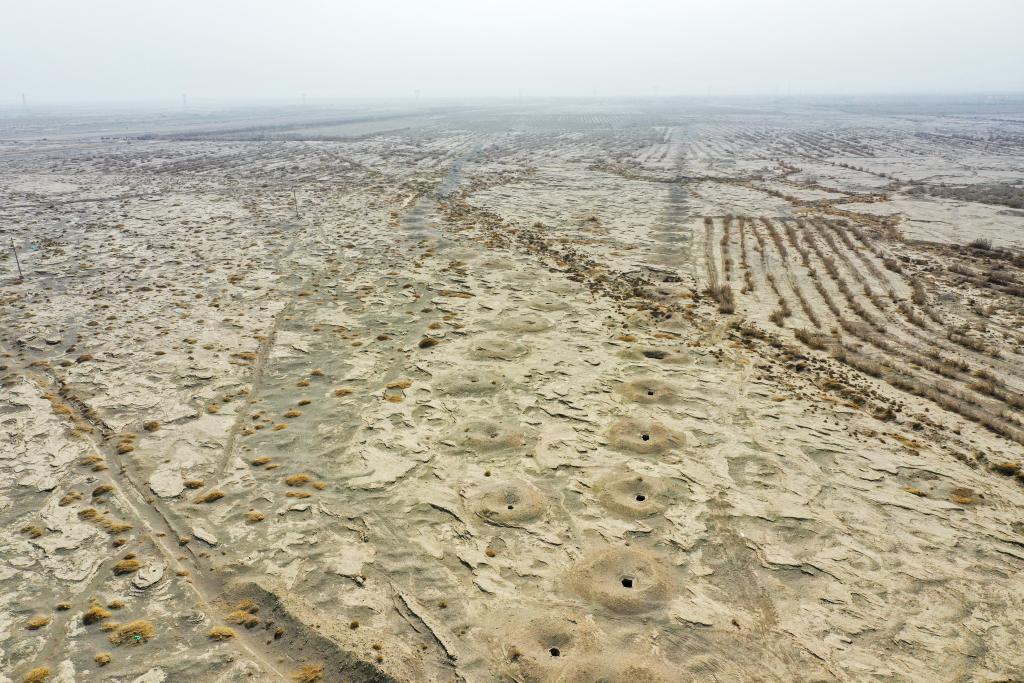一列吐鲁番坎儿井井口(无人机照片)。新华社记者 丁磊 摄