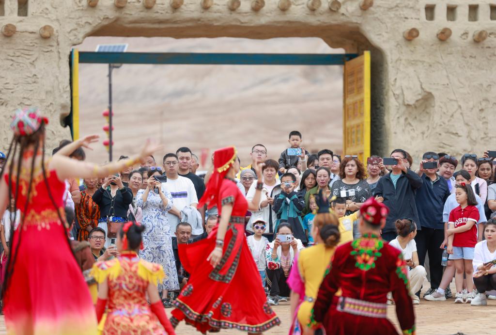 游客在吐鲁番市吐峪沟景区欣赏民族歌舞表演。新华社记者 王菲 摄