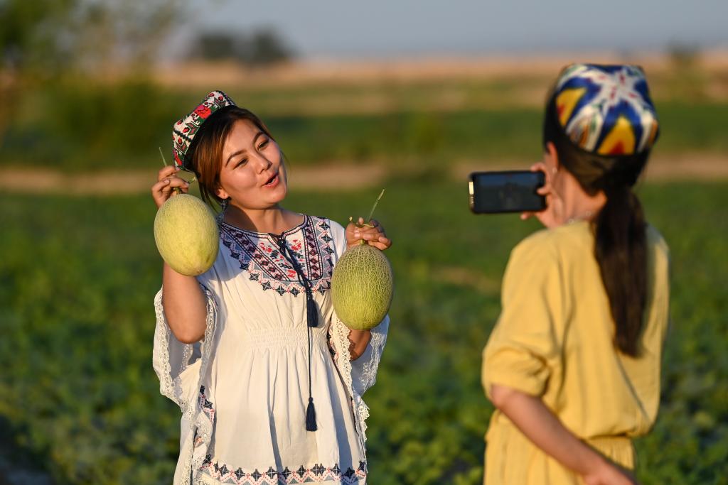 吐鲁番的一名网络主播在拍摄短视频推介家乡的哈密瓜。新华社记者 丁磊 摄